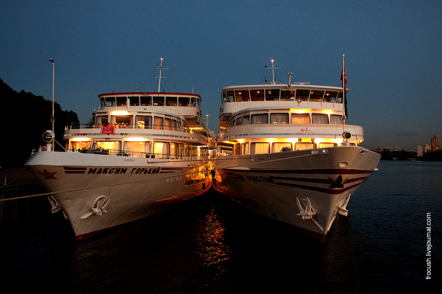 19 мая 2010 года. Теплоходы «Максим Горький» и «Лев Толстой» у причала Северного речного вокзала Москвы. Вечернее фото.