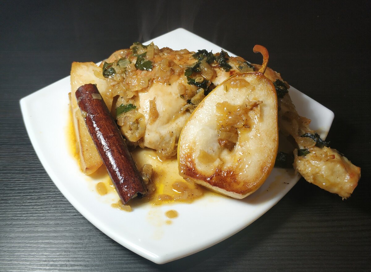 Просто и достаточно необычно: сочетание нежного куриного мяса и сладости спелой запеченной груши. Очень ароматное и вкусное блюдо. Попробуйте и приятно удивитесь!