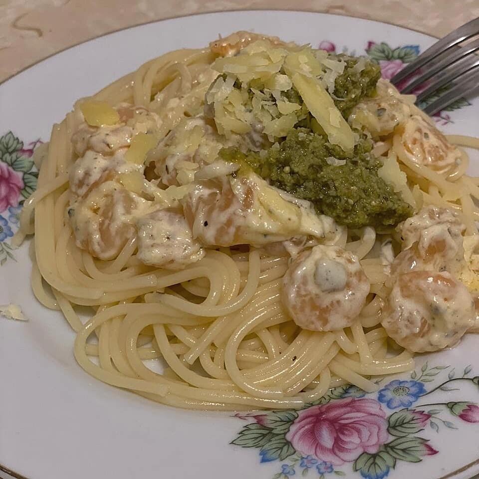 На тарелку выкладываю спагетти. Сверху креветки с соусом и песто. Посыпаем немного сыром.
