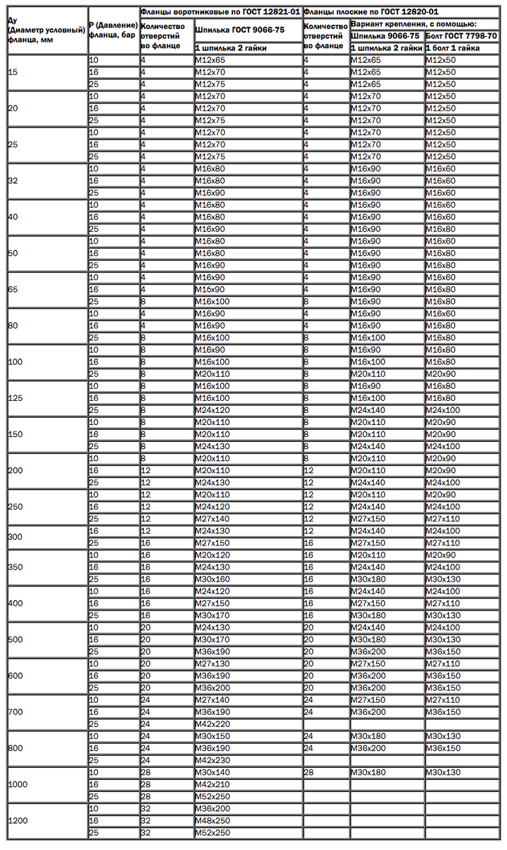 Таблица расчета крепежа для фланцев