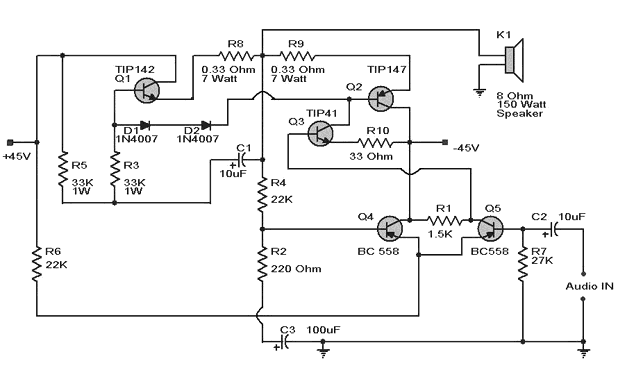 Мне кажется, найти более простую схему усилителя на 150 Вт просто невозможно. Сделанная на двух транзисторах Дарлингтона, схема отдает в нагрузку 4 Ом мощность 150 Вт.