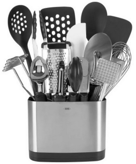 - Этот набор представляет "собой комплект из пяти функциональных кухонных аксессуаров , которые пригодятся в каждой квартире . Он включает : пресс для чеснока , удобный штопор для открывания бутылок , открывалку для банок , щипцы для колки орехов и аккуратный нож для чистки овощей . Все предметы компактно установлены на небольшой подставке , оснащенной ручкой с кольцом и углублением для каждой единицы , занимают очень мало места "