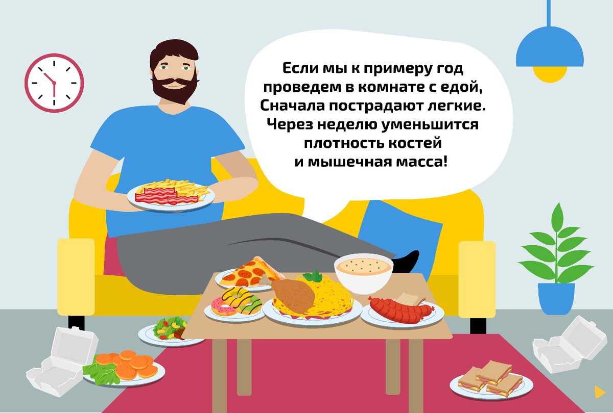 Итак, что же произойдёт, если мы к примеру год проведём в комнате, затарившись едой и питьём в лежачем положении?