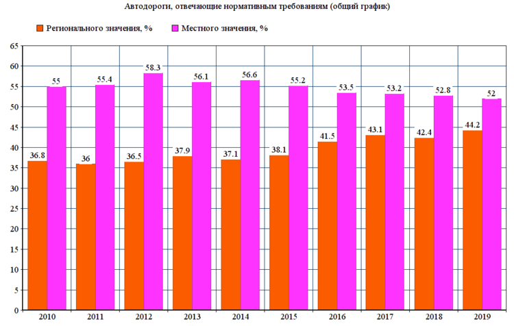 1. В России постепенно растёт качество автодорог. Как видно по заглавному графику, дороги местного значения постепенно переводятся в категорию более высокого уровня – дороги регионального значения. Это предполагает существенное улучшение качества таких дорог: