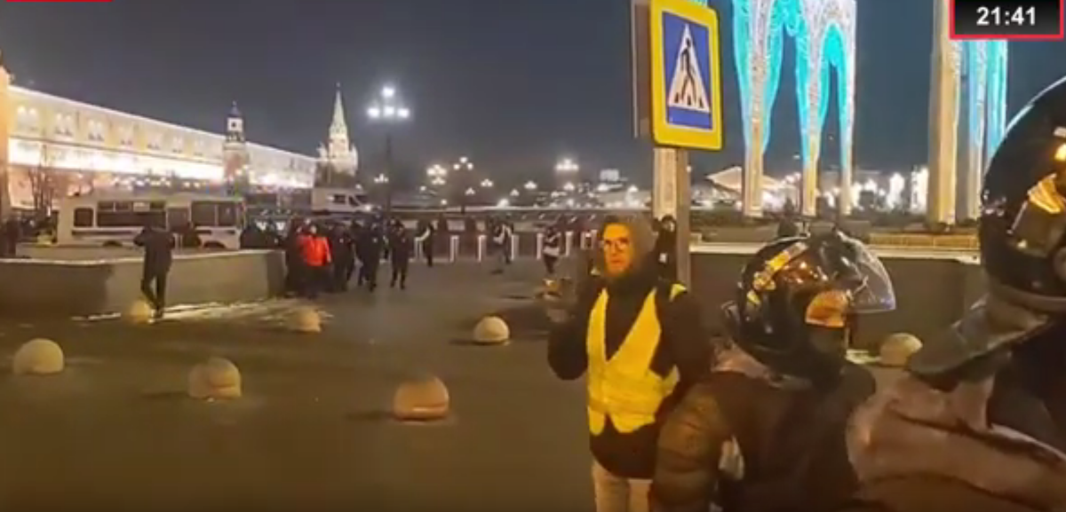 Тусовка в желтых жилетках, устав ждать, опять пошла вдоль "Москвы" по направлению к памятнику Карлу Марксу. Блогер продолжал говорить, что всё очень скомкано - трудно отличить прохожих от тех, кто пришел поддержать Алексея. Чат ставил новые и новые вопросы.