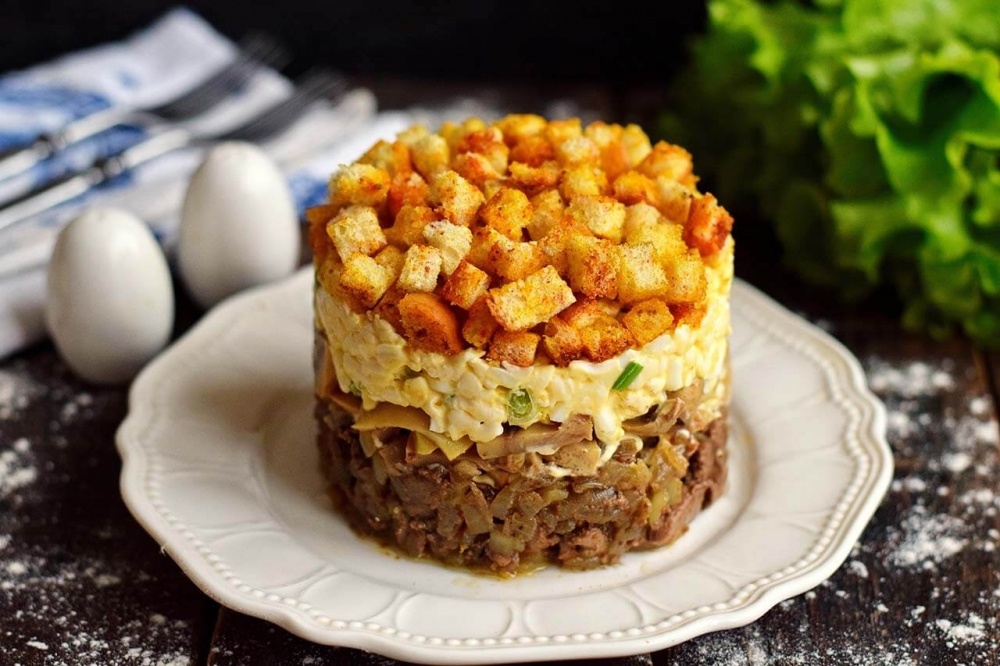 Салат с таким интересным названием Веселый пень можно отнести к популярным блюдам для праздничного стола. Подается он в виде небольшого пенька, сделанный благодаря формовочному кольцу. Пенек имеет 4 слоя из разных компонентов — жареная куриная печень с луком, маринованные грибы, нежная смесь яйца и мягкого сыра, в завершении салат посыпается пряными сухариками. Сухарики лучше приготовить самостоятельно в домашних условиях. Салат получается очень сытным, при подаче не требует дополнений.