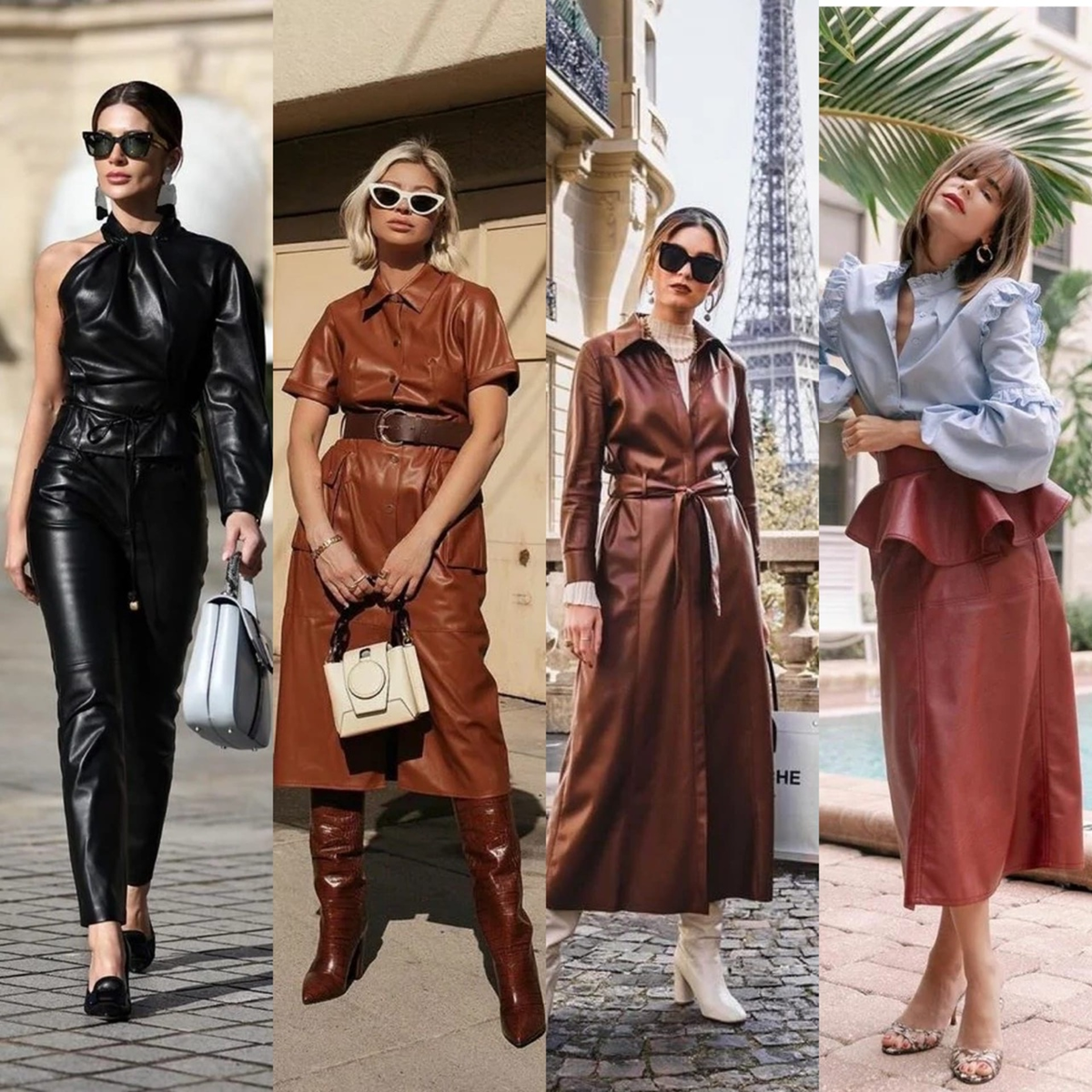 - Кожаные вещи можно даже отнеси к базовым, так как они удачно сочетаются с различными видами тканей, цветами, всевозможными принтами и даже фасонами.