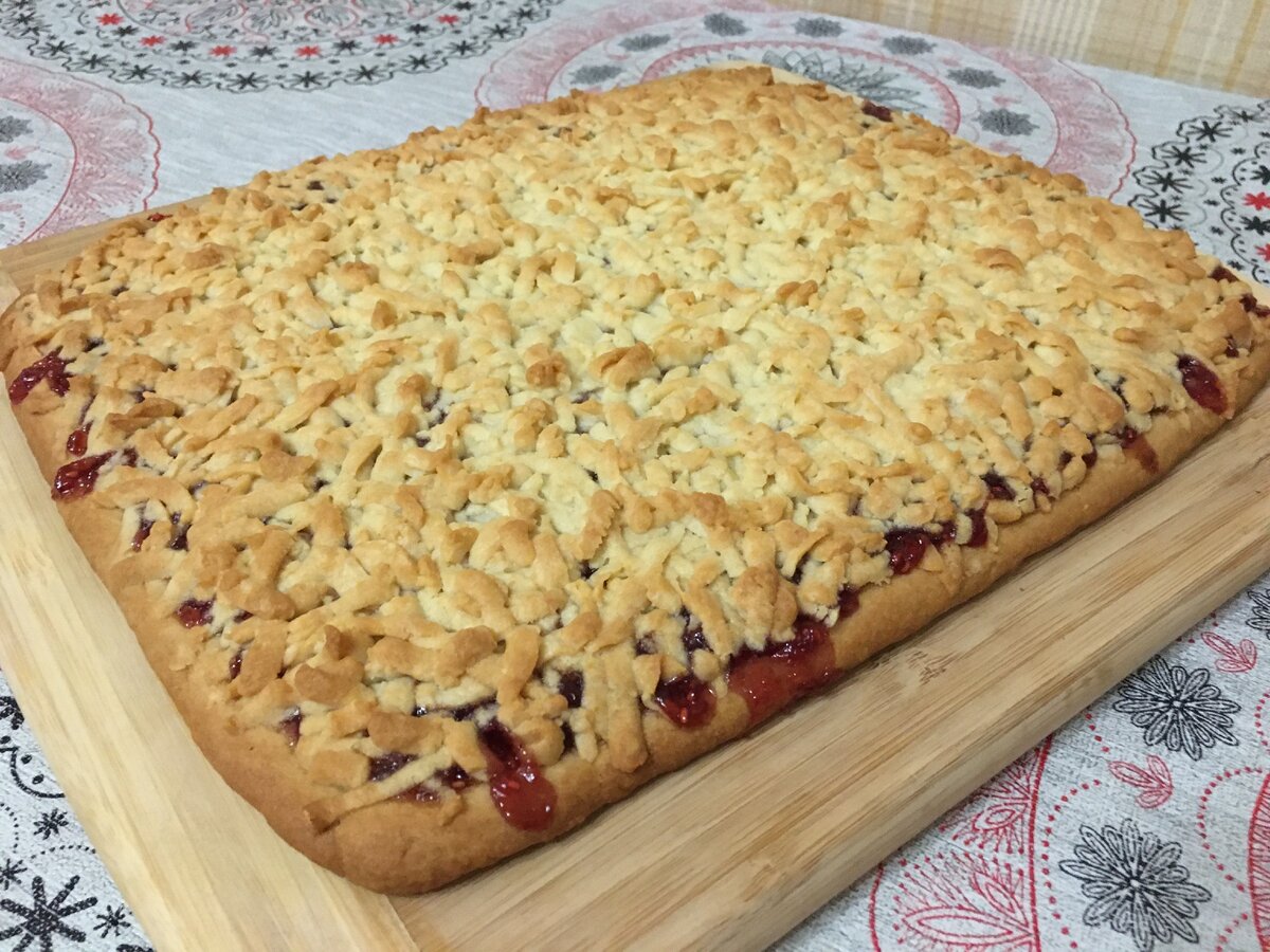 Я думаю, все знакомы с этим лакомством! Предлагаю классический рецепт тертого пирога. Начинку в этом пироге можно менять, получая тем самым каждый раз новый вкус. Готовится пирог очень легко! Тесто получается нежным, рассыпчатым, тающим во рту! Нам больше всего нравится готовить этот пирог с джемом. Ингредиенты: Способ приготовления: Муку смешиваем с разрыхлителем. Сливочное масло натираем на крупной терке и добавляем в муку. Перетираем масло с мукой в крошку. В отдельную миску разбиваем 1 яйцо, добавляем сахар, щепотку соли и ванилин. Перемешиваем венчиком добела. Добавляем 2 ст.л. сметаны и еще раз перемешиваем. В масляную крошку добавляем яично-сметанную смесь и замешиваем мягкое тесто. Отделяем от теста 1/3 часть и убираем в морозилку на 20 минут. Вторую часть теста раскатываем на пергаментной бумаге, формируя прямоугольник, толщиной 7 мм. Переносим на противень. Джем равномерно распределяем по всей поверхности теста. Второй кусок теста достаем из морозилки и натираем сверху на кру