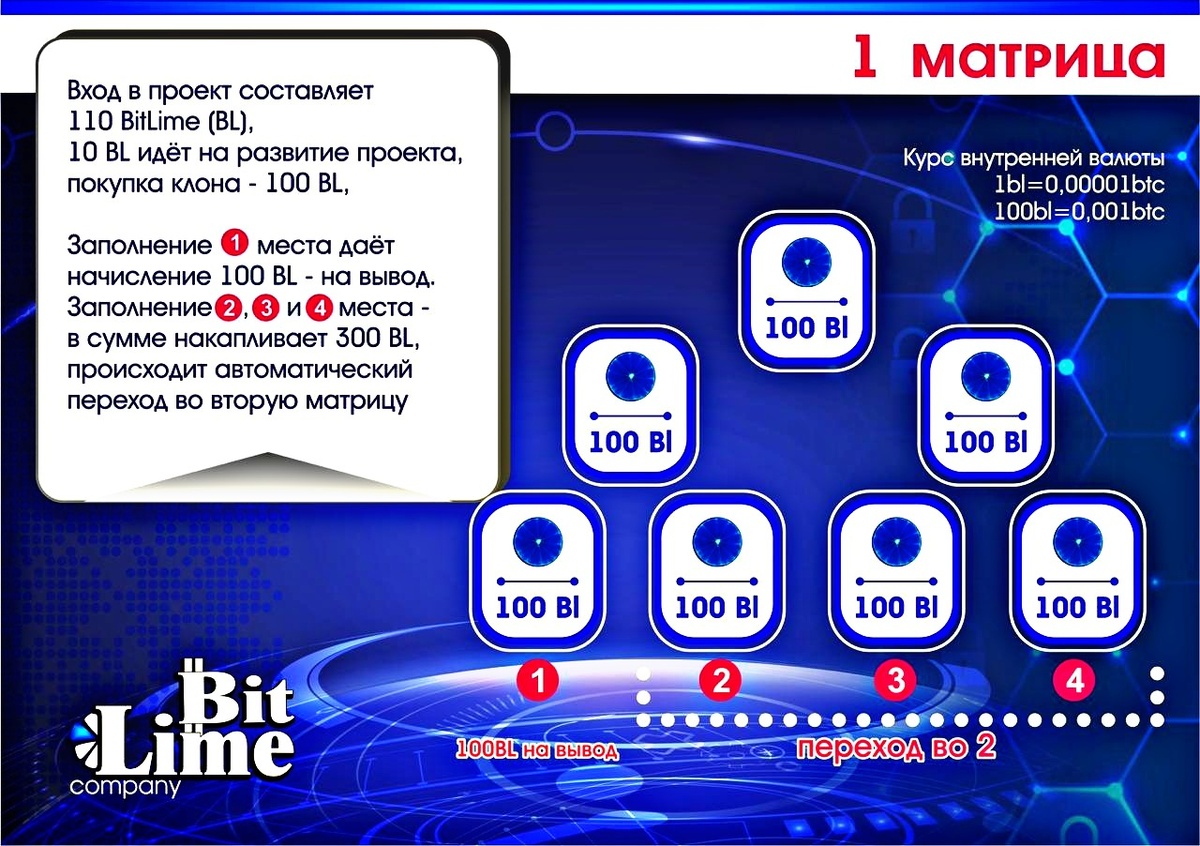 Как только в 1 матрице заполняется первое место в нижнем ряду, нам идёт 100 битлаймов на вывод. Эти средства моментально поступают на наш счёт. Мы их видим в личном кабинете в разделе "финансы".