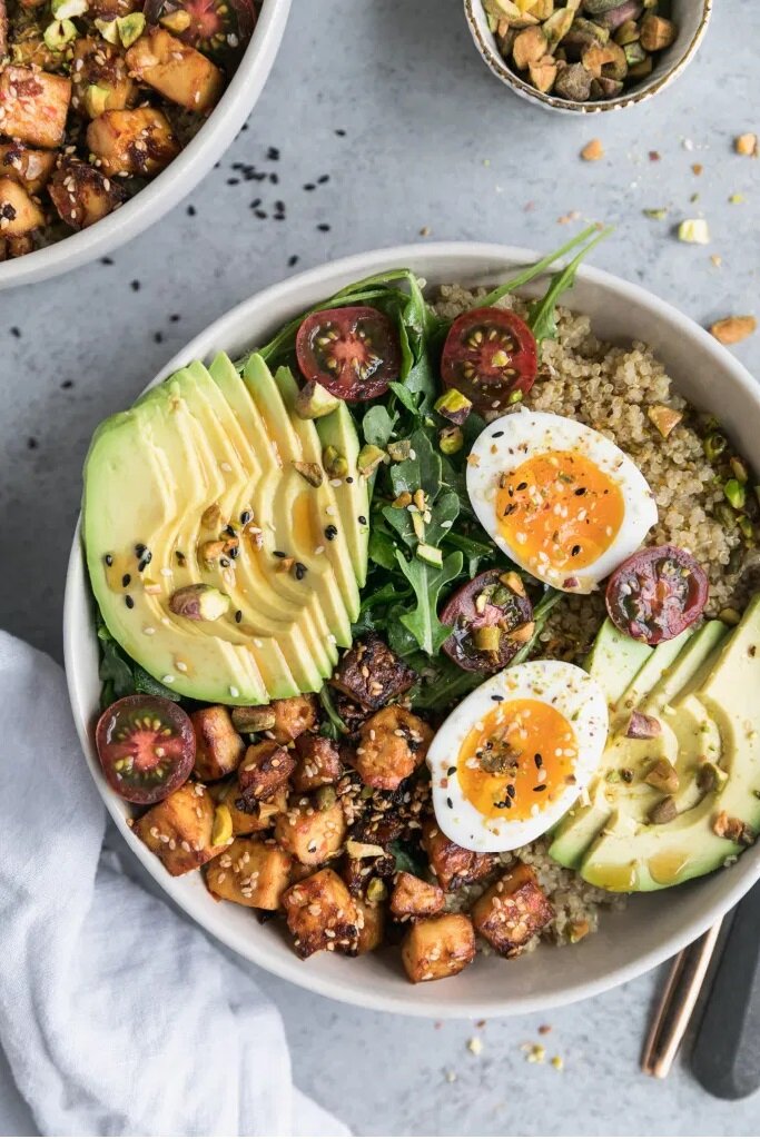 Эти блюда с киноа увенчаны супер ароматным кунжутным тофу, авокадо, яйцами всмятку и рукколой. Они посыпаны жареными, солеными рублеными фисташками - это отличный постный обед!