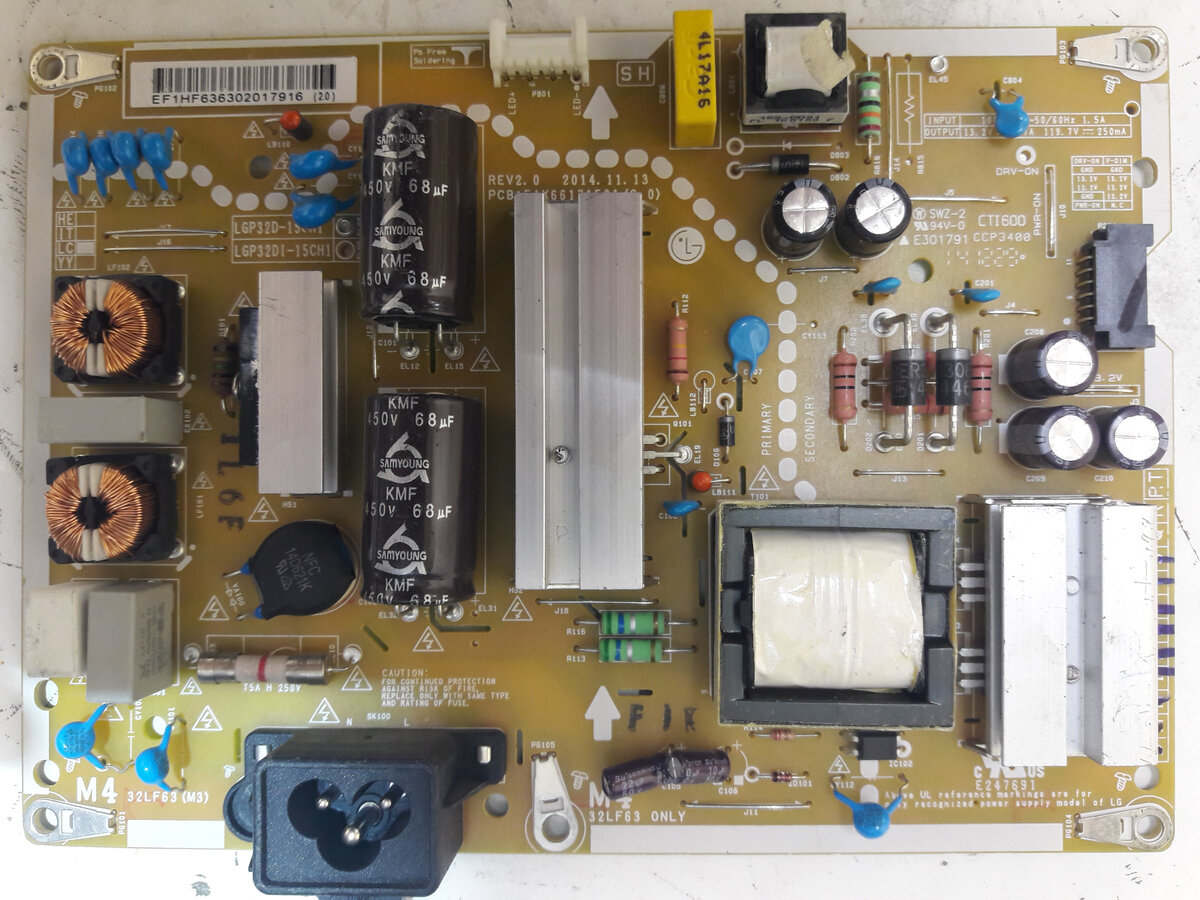 Модель блока питания eax66171501 2.0 (LGP32D-15CH1) Блок на фото ниже. Фото сделано с исправного блока с видимыми маркировками деталей. На нём я показываю заменённые элементы.