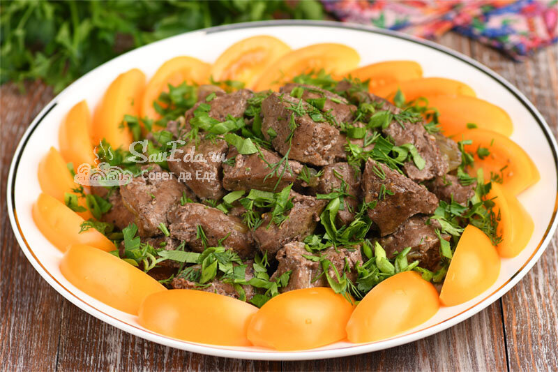 7. Нежнейшую говяжью печень перекладываем на тарелку, дополняем овощами, зеленью и подаем на стол с любимым гарниром. Печень таким способом получается очень ароматная и невероятно вкусная.