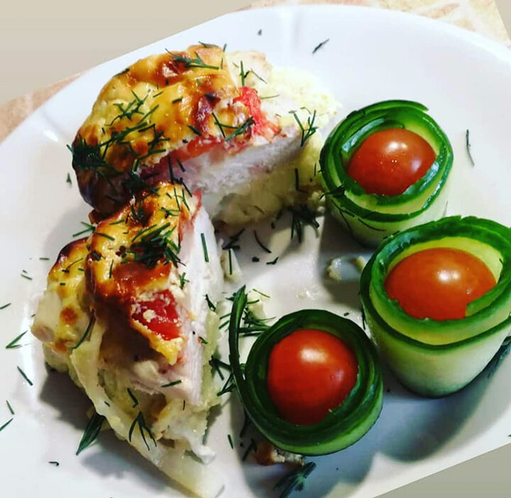 В форму выкладываем стейки из цветной капусты, сверху грудку куриную, чуть присолить, поперчить, далее лук и кружок помидорки. Смешиваем соус до однородного состояния, чуть присолив и поперчив. Выкладываем соус на помидорку. Выпекаем 40 минут при температуре 180 градусов. В качестве гарнира - огурчик и черри.