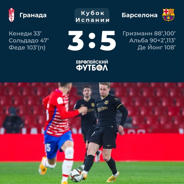 В матче 1/4 финала Кубка Испании «Гранада» уступила «Барселоне». Встреча проходила на стадионе «Лос-Карменес» в Гранаде и завершилась победой гостей в овертайме со счётом 5:3.