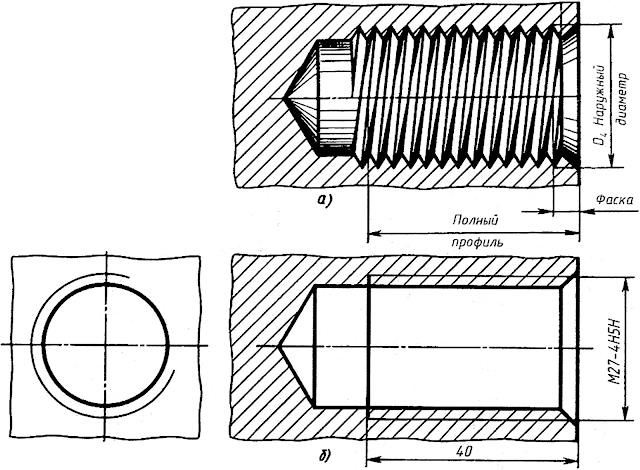 - На создаваемых чертежах обозначается профиль витков буквой Н. В большинстве случаев профиль напоминает треугольник. Применяемые методы обработки определяют формирование скругленной фаски в качестве вершины.