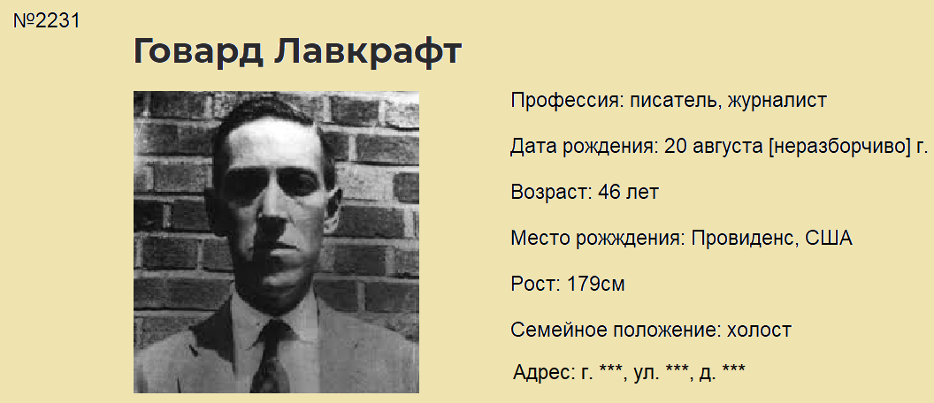 —Лавкрафт, Говард. Род деятельности: писатель. Семейное положение: безнадёжный одиночка. Тут даже распорядок дня есть.