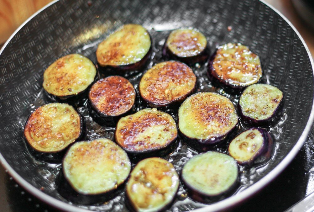 1. В первую очередь баклажаны нарезаем тонкими кружочками и обжариваем на оливковом масле с обеих сторон по 3 - 4 минуты. Далее выкладываем их на бумажные полотенца или салфетки, чтобы вытекло излишнее масло.