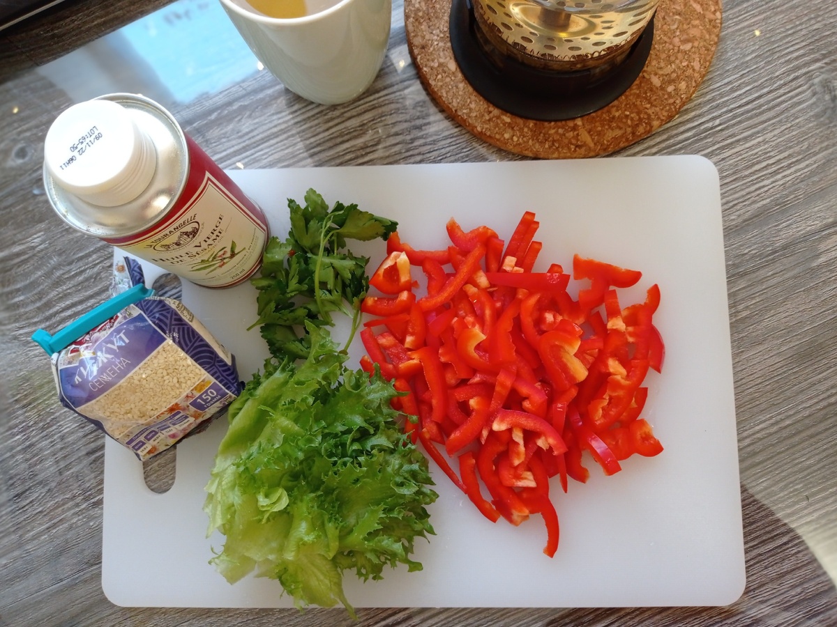 Нужно всего лишь измельчить листья салата до среднего размера, нарезать перец стружкой, порезать петрушку.