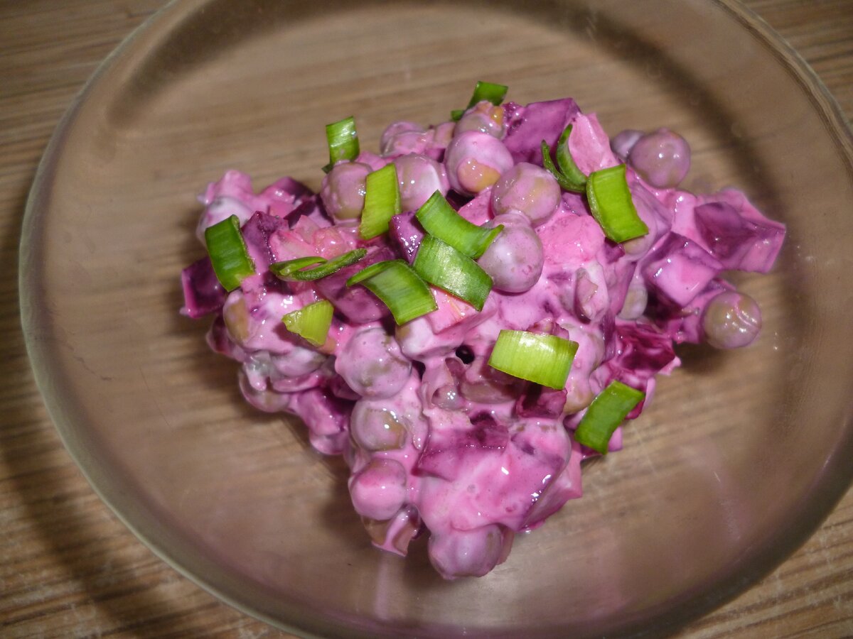 Вареная свекла Зеленый горошек консервированный хорошего качества. Растительное масло. Соль - по желанию.
