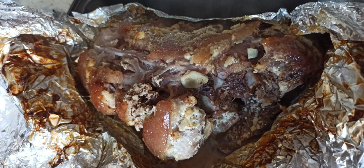 Рульку необходимо разморозить, нарезать чеснок дольками, сделать надрезы в мясе и вставить чеснок. В блюдо для запекания ложим фольгу и наверх укладываем рульку.