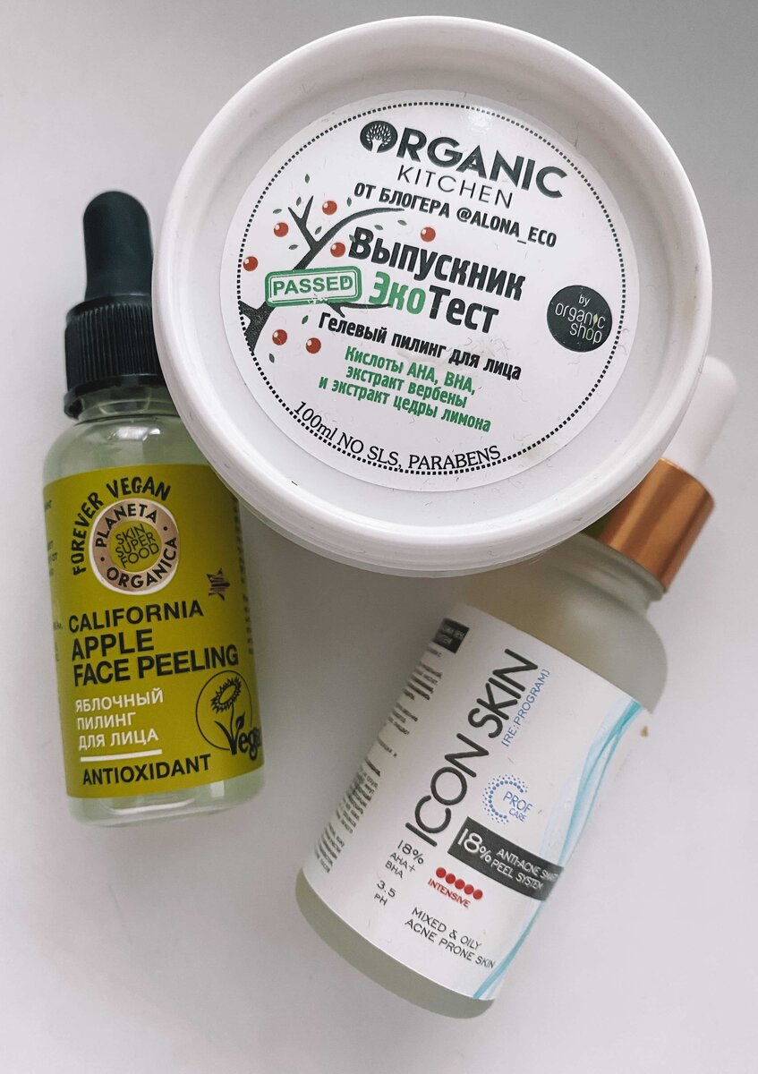 2. Пилинг от Organic Kitchen выпускник ЭкоТест. Он уже не такой агрессивный, хотя тоже сочетает в себе и АНА, и ВНА кислоты. Больше всего мне нравится этот пилинг из за того, что он лучше всего убирает следы от постакне, выравнивает рельеф кожи.