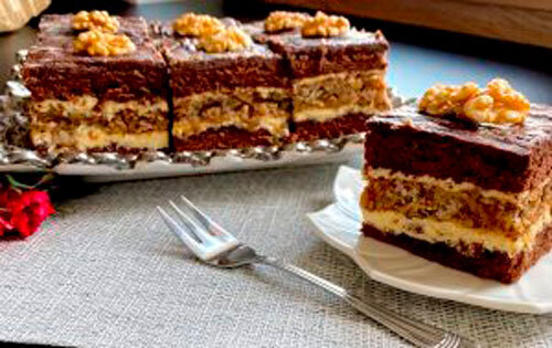 Какао-бисквит с ореховым безе и восхитительным заварным кремом, покрытый шоколадной глазурью. Очень вкусно!