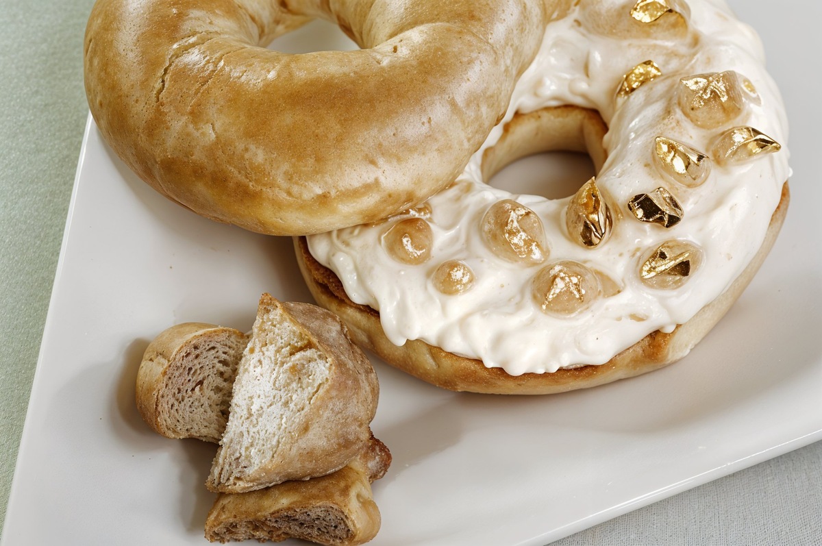 $1000 – стоимость сдобного бублика, изготовленного по рецепту Франка Таджагу, работающего шеф-поваром престижного нью-йоркского отеля Westin Hotel. В составе блюда — трюфели, элитные сорта сыра и варенье из годжи, для подачи используются листья пищевого золота.