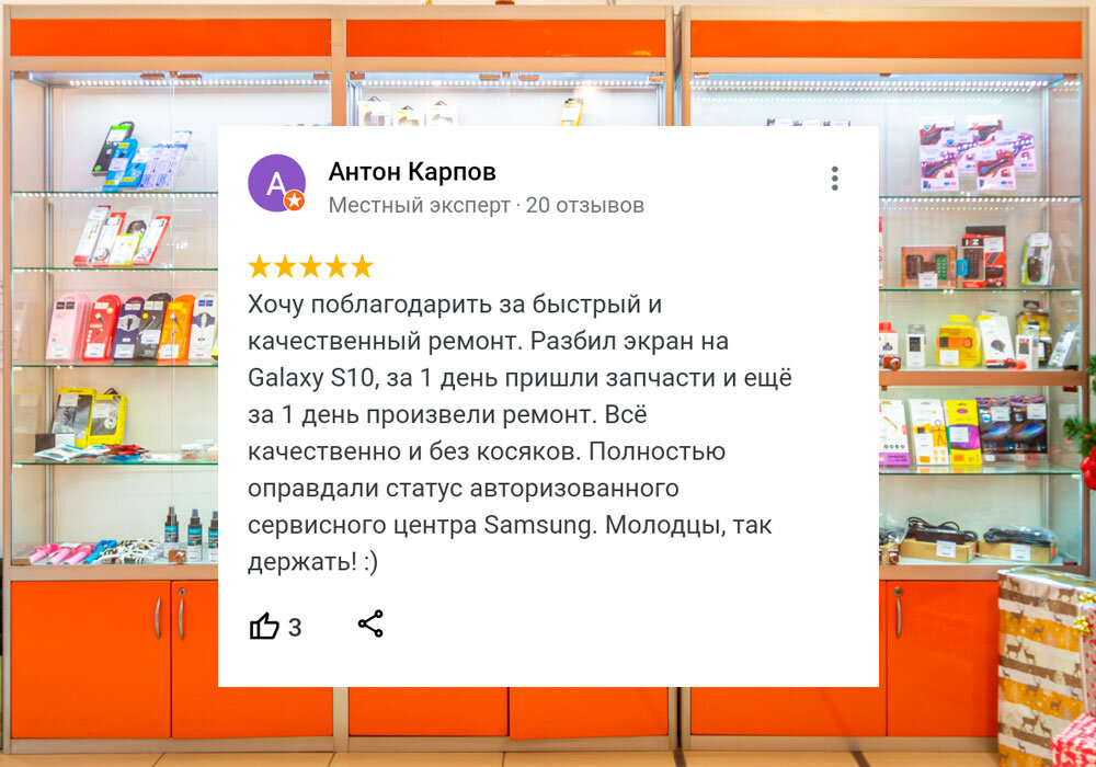 "Хочу поблагодарить за быстрый и качественный ремонт. Разбил экран на Galaxy S10, за 1 день пришли запчасти и ещё за 1 день произвели ремонт. Всё качественно и без косяков. Полностью оправдали статус авторизованного сервисного центра Samsung. Молодцы, так держать! :)"