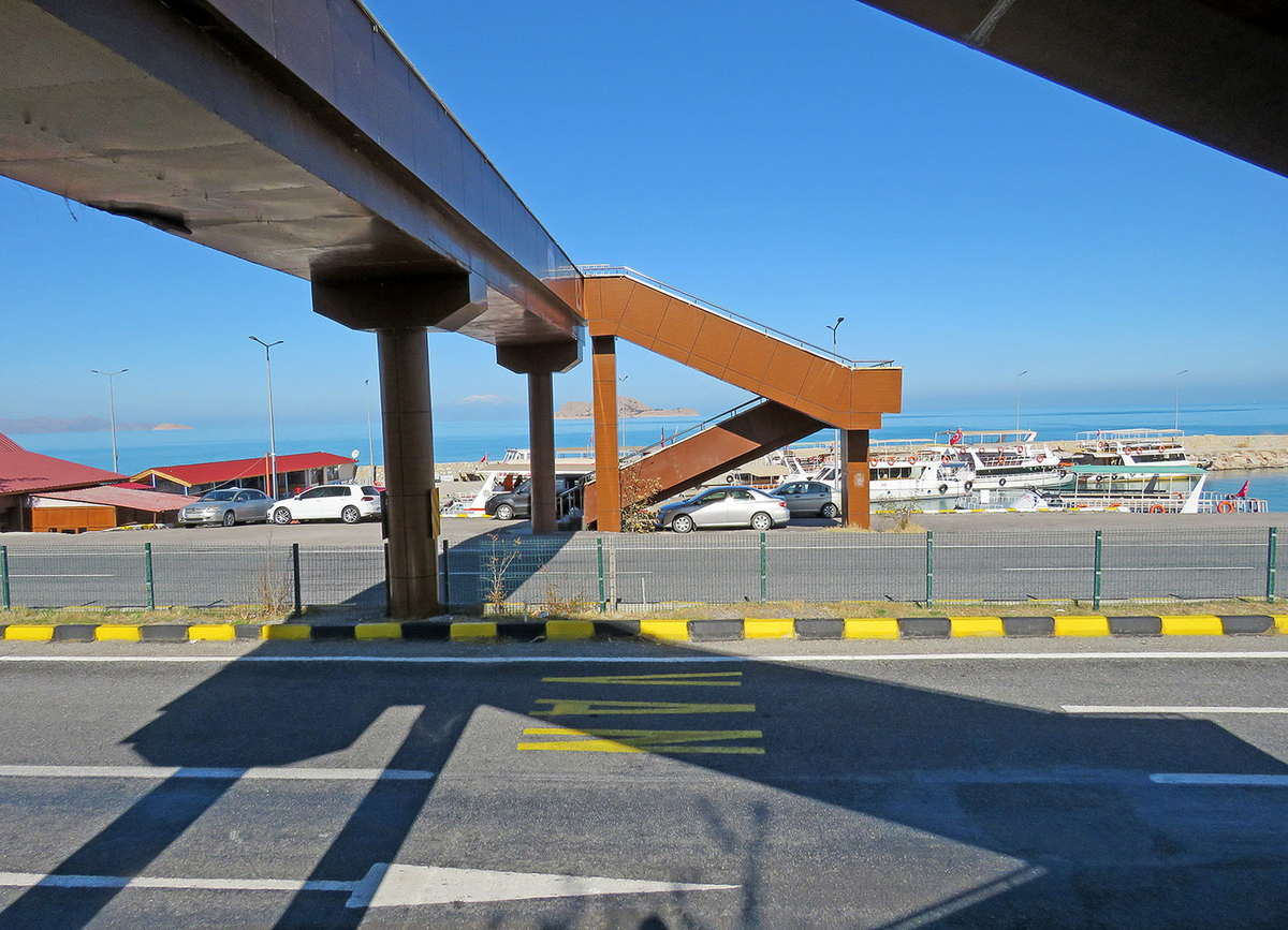 Высадившись у здоровенного пешеходного моста над пустынной трассой, мы увидели голубой простор Вана, белеющий над ним заснеженный Сюпхан (4038м), пару островов на его фоне и отгороженную пирсом гавань, густо набитую катерами. У одного катера тарахтел мотор, и по верхней палубе ходили люди. Уже не помню откуда я знал, что катера до Ахтамара ходят каждый час, а потому мы со всех ног побежали через мост. Катер успел отшвартоваться от причала - но всё же пару минут подождал отходить при виде двух иностранцев: