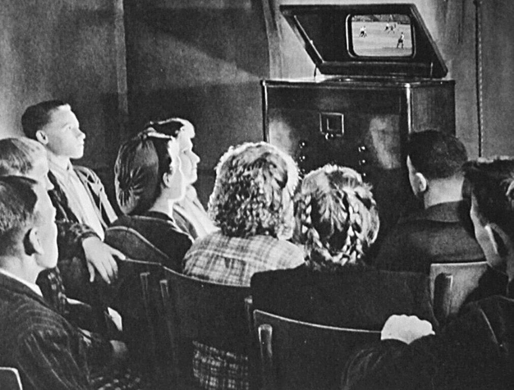 У нас сломался телевизор, перестал работать, а школа уже купила свой и мы вечерами ходили смотреть интересное кино в школу. Там, как в кинозале, были расставлены рядами лавки в коридоре, телевизор поставлен повыше, чтобы всем было видно. А так как, меня в любое время могут позвать домой за чем-либо, то я села на предпоследнем ряду с самого края.