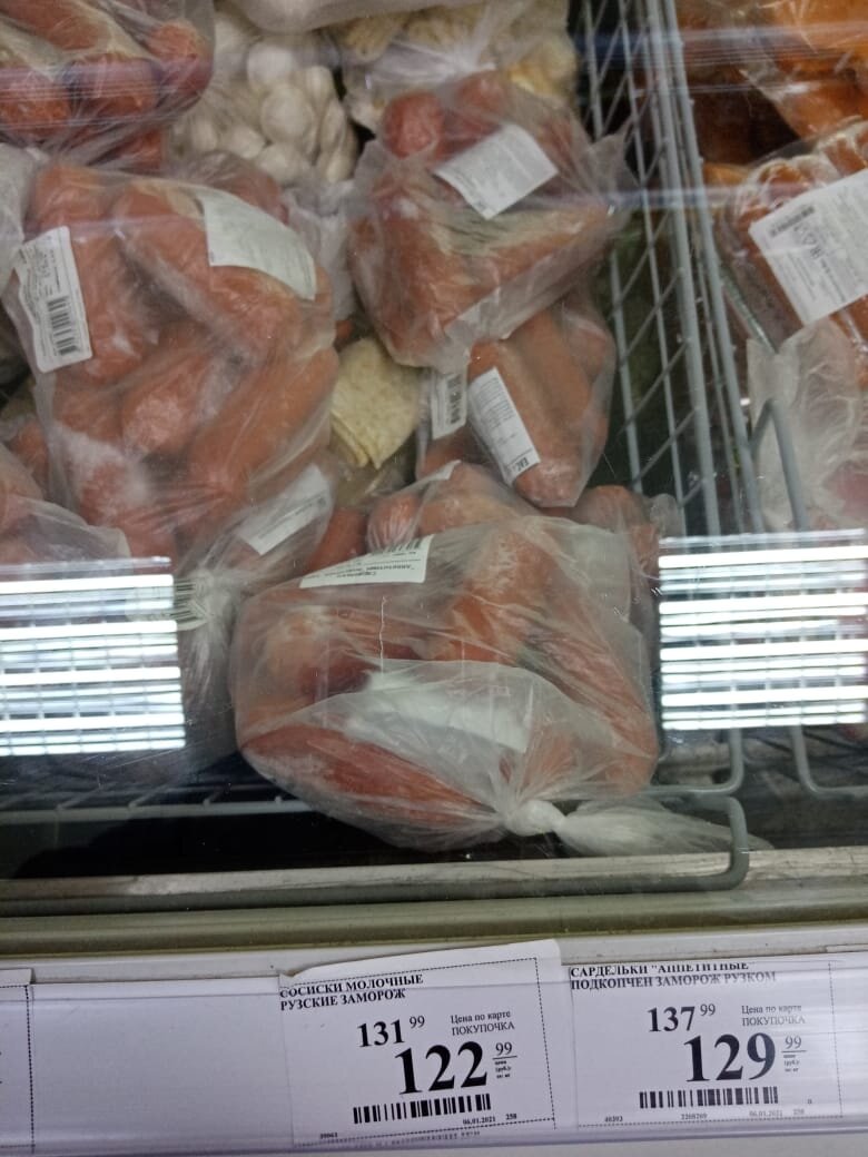 Всем, привет! Сегодня у нас на обзоре довольно интересный клиент)) Первый раз такое увидела, сосиски замороженные от компании "Рузком", всего за 122,99 рублей за кг. Куплено в сети "Покупочка".