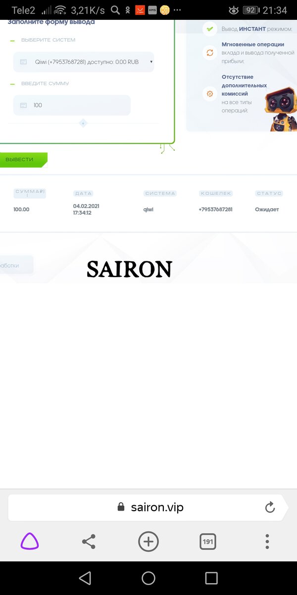 79625445385 киви мошенники, сайт работает с 03.02.2021, вложил 100р, через сутки поставил на вывод, деньги не пришли, в поддержки тишина. Вложил ради проверки, много хороших отзывах написано про sairon, все развод проверенно, на эти деньги лучше мороженку возмите