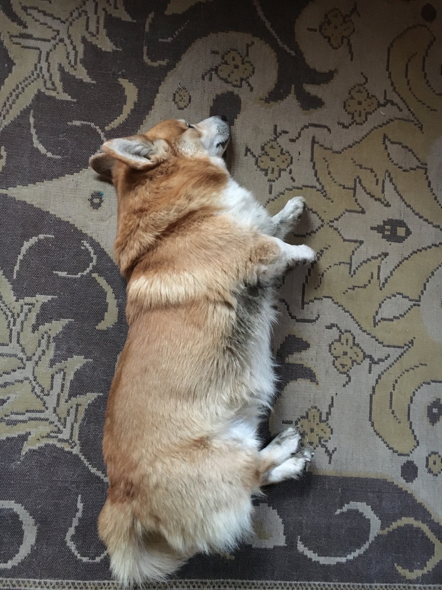 Рабочий день заканчивается - перемещаемся к креслу и телевизору. Собаку специально выбирала из тех, которые по кроватям и диванам не валяются. Угадала, нашего корги не уговоришь никуда запрыгнуть. Я сижу в кресле, и собака - рядом, сразу подсовывает под руку голову и бока, чтобы чесали, не сидели просто так.