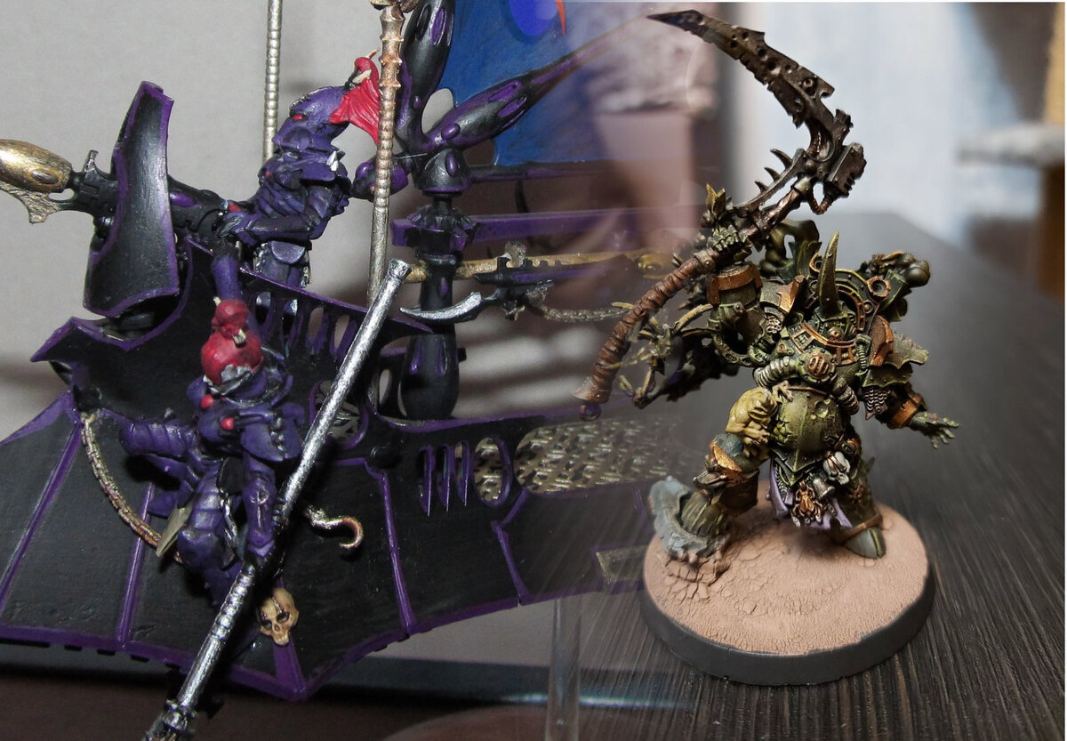Шло время, игры наигрывались, росли с ними и потребности. Долгое время меня терзало желание приобрести такую большую но такую офигенскую гига-лодку Тёмный Эльдар: Танталус. Ну и, да, мечты сбываются. В один прекрасный момент я задавил внутреннюю жабу, да ещё и нашёл где можно купить столь желанную мной миниатюру, и вот она. Параллельно я, таки, взял поиграть всё у того же друга армию ХСМ, в свете чего (с его разрешения) продолжил её покрас под свой вкус. Хаоситы мне в итоге зашли: не зря я в своё время на них поглядывал.