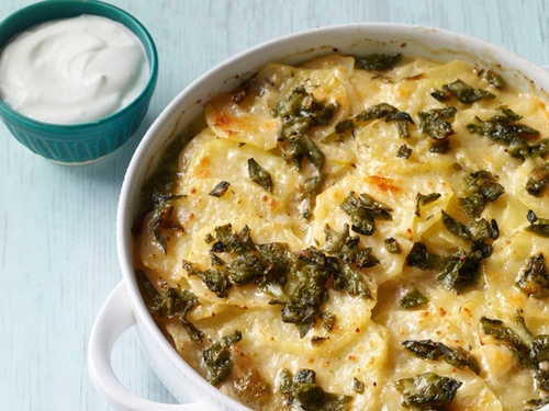 - Перелить в подготовленную форму половину картофельного бульона. Выложить ровным слоем половину картофеля, затем половину жареного перца поблано, посыпать половиной сыра пармезан. Затем полить оставшимся бульоном, выложить оставшиеся овощи и посыпать сыром. Поставить картофель в духовку и запекать, до золотистого цвета, приблизительно 35 мин. Подавать картофельный гратэн со сметаной.