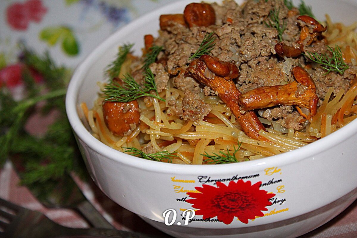 Выложить в тарелку немного обжаренной вермишели и сверху положить немного обжаренного фарша с грибами