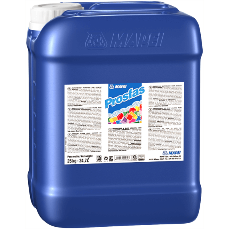 Prosfas (Просфас ) – грунтовка на водной основе с силикатными связующими. Данный материал обладает очень низкой вязкостью и способен проникать глубоко внутрь основания. Prosfas повышает когезию (связывание ) цементных частиц основания в одно целое, что в конечном итоге приводит к укреплению основания.