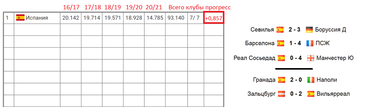 Как изменилась таблица УЕФА после матчей Лиги Чемпионов и Лиги Европы? Всего 2 страны сохранили все свои команды. На первом месте - Испания. Три клуба проиграли и два выиграли. Прогресс недели составил + 0,857.