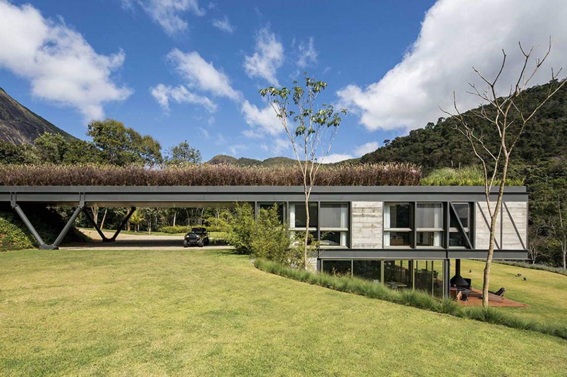 Расположенный на ступенчатом участке, он обращён в сторону склона и имеет, в зависимости от рельефа, от одного до двух этажей. В одноэтажной части находится крытая стоянка. Центром дома стала роскошная двухсветная гостиная. На плоской крыше разбит самый настоящий сад, а внизу, под консолью, находится веранда длиной около 20 метров. Основные конструкции дома выполнены из металла и бетона.