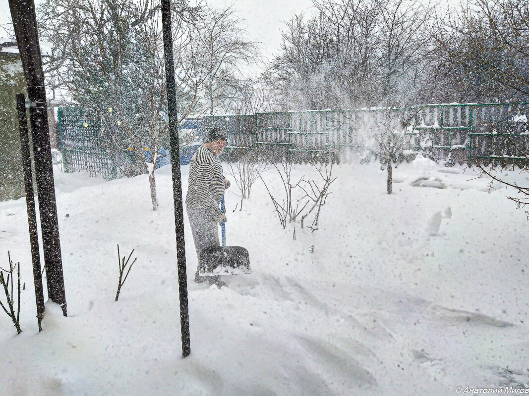 И вот утром весь наш двор завален снегом. Где по колено, а где еще выше.