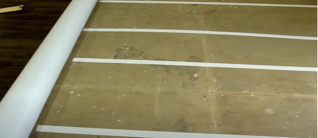 Для надежной фиксации линолеума, использовали двухсторонний скотч на тканевой основе. После этого раскатываем линолеум на поклеенный скотч.