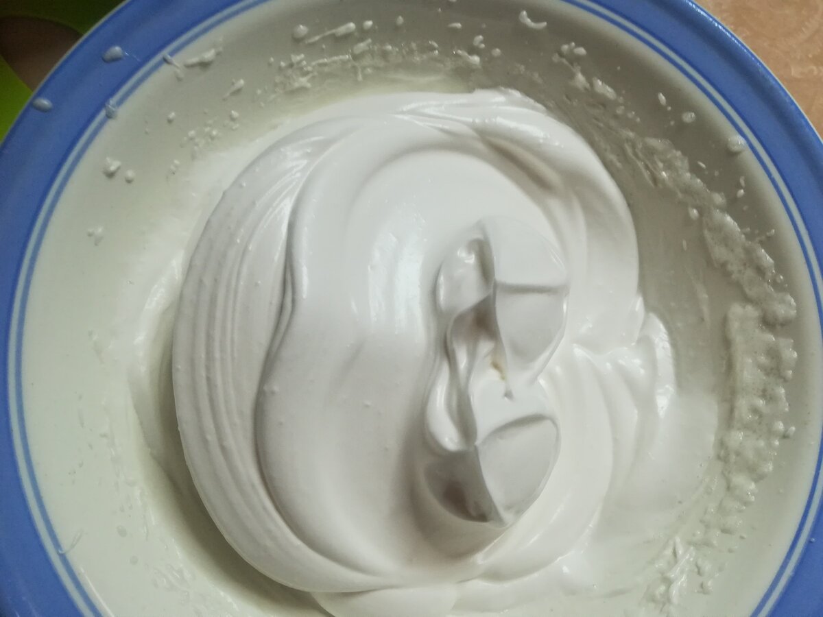 Белки взбиваем до густоты, добавляем половину сахара и продолжаем взбивать до блестящего плотного состояния.
