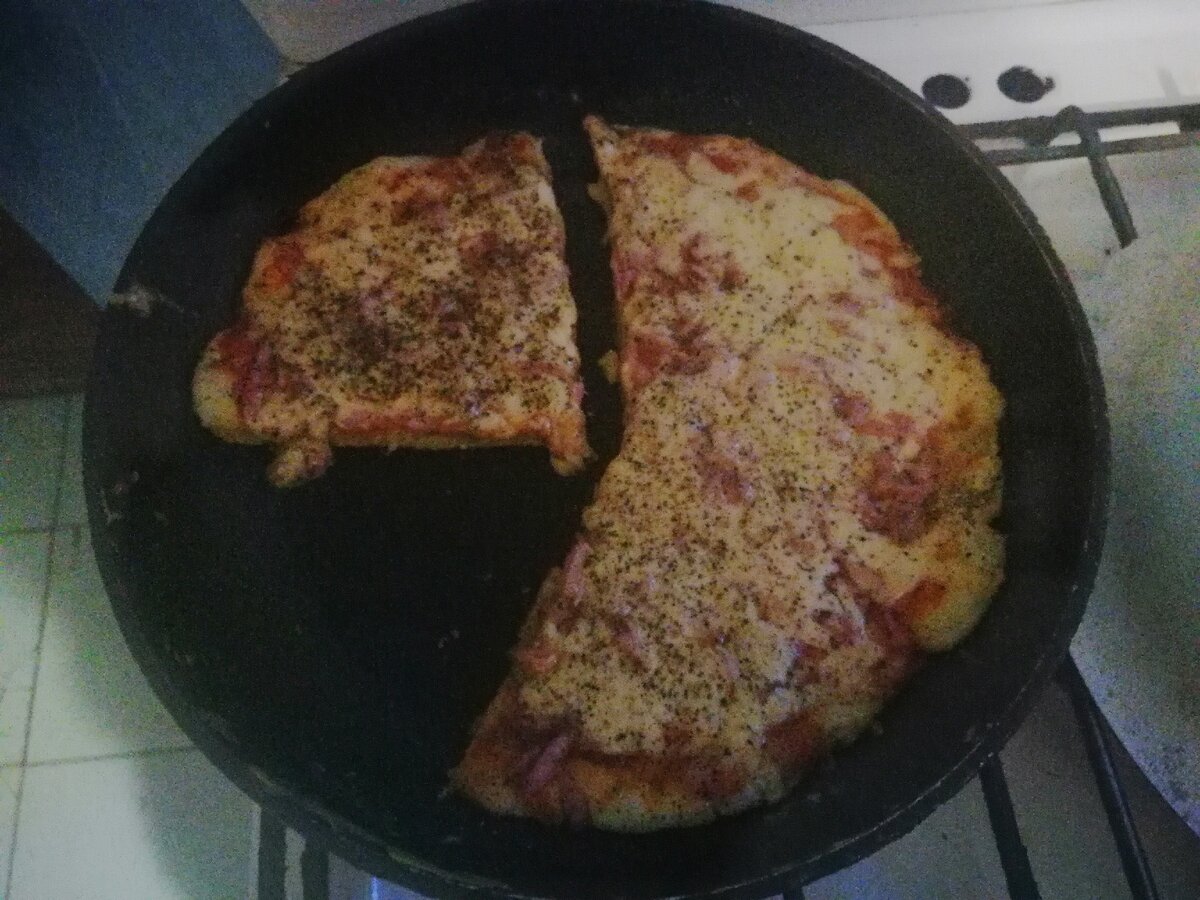 При помощи блендера смешайте продукты для теста. Нарежьте продукты для начинки, сыр натрите на крупной тёрке. Нарезанные продукты обжарьте на сковороде с небольшим количеством растительного масла. Как только начинка будет готова, разровняйте её по дну сковороды и залейте тестом, накройте крышкой и обжарьте до схватывания теста. Затем переверните, стараясь не разорвать, и обжарьте с другой стороны, также накрыв крышкой. Подайте, посыпав зеленью.