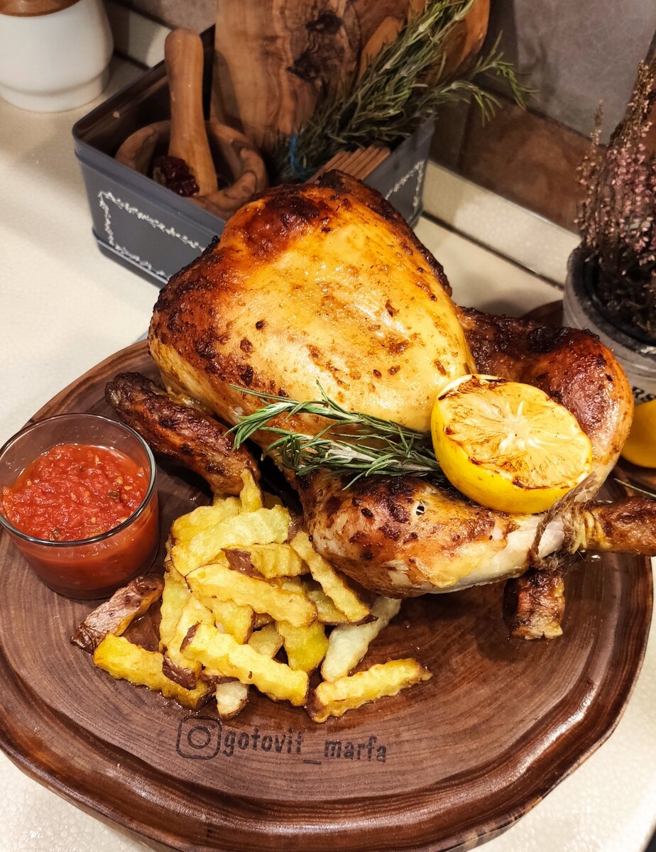 Курицу я запекала целиком на специальной насадке, но можно использовать и обычную стеклянную бутылку.
