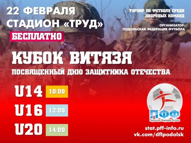 Как сообщили в пресс-службе ФК «Витязь», 22 февраля на запасных полях спорткомплекса «Труд» Подольская федерация футбола проведет уже традиционный турнир ко Дню защитника Отечества – Кубок Витязя.