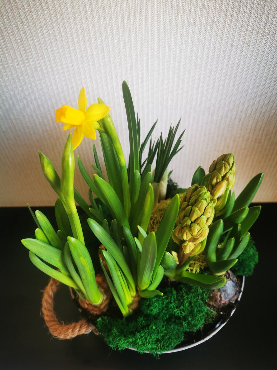 У меня есть несколько кусочков стабилизированного мха. В прошлом году купила целую коробку серо-голубого ягеля и обменяла часть у знакомого флориста на другие цвета. Теперь у меня есть мох разных оттенков зеленого. Закрываю им участки между растениями, и наша чудесная весенняя композиция готова. Осталось только сделать финальные кадры, и изо дня в день наблюдать за ростом и цветением мини сада!