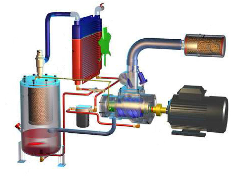- Устройство винтового электрического компрессора. Конструкция предусматривает наличие двух узлов — электродвигателя и роторной пары. Он также превращает электрическую энергию в механическую. Ременная или прямая передача передает усилие на ведущий ротор, который заставляет двигаться ведомый. При вращении винтовой пары объем полостей, создаваемых плоскостями роторов и внутренней поверхностью корпуса, то увеличивается или уменьшается. В первом случае получается разряжение, а во втором — сжатие воздуха.