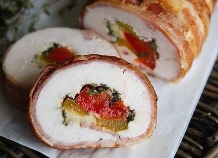 2. Куриную грудку отбить ,при этом стараясь придать ей форму близкую к прямоугольнику.Положить один на второй 5 ломтиков бекона.Ломтики должны слегка пересекаться и создавать область чуть больше чем куриная грудка.Положить на бекон отбитую грудку.
