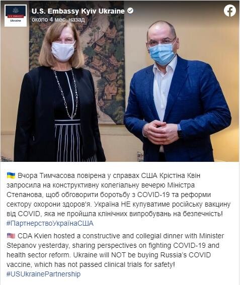 "Украина не будет закупать российскую вакцину от COVID-19, которая не прошла клинических испытаний на безопасность!" – заявили в посольстве по итогам встречи со Степановым.