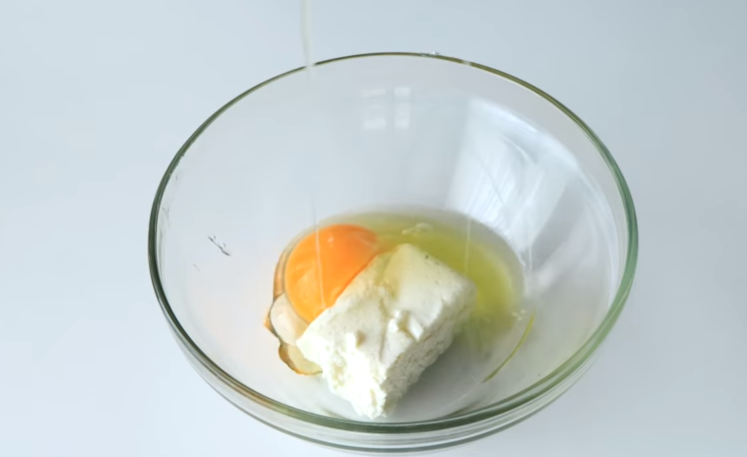 Добавляем в миску творог, яйцо и тщательно перемешиваем до состояния однородной массы.